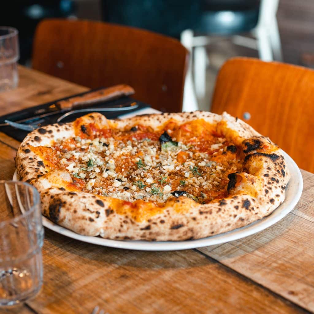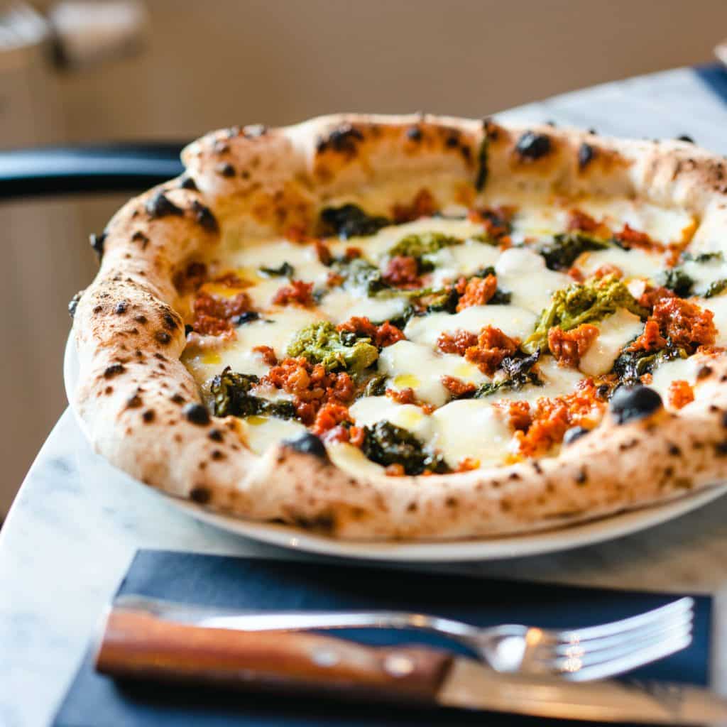 Tomates San Marzano DOP, provola fumée d’Agerola, n’duja de Spilinga, olives, grana padano, basilic